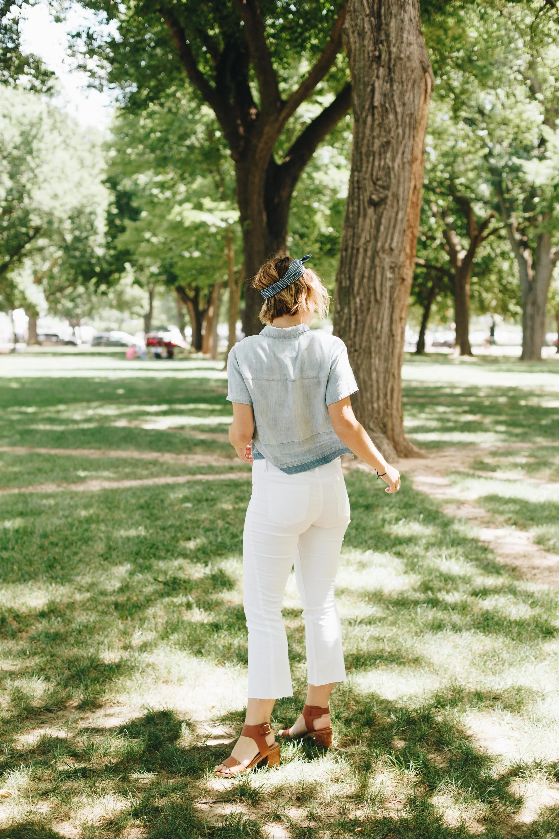 Wearing Rails Gemma Dip Dyed Frayed Hem Shirt, Blank NYC White Crop Flare Jeans, Nacelle initial necklace, Gorjana bracelet, headband, and Swell water bottle via South Moon Under.