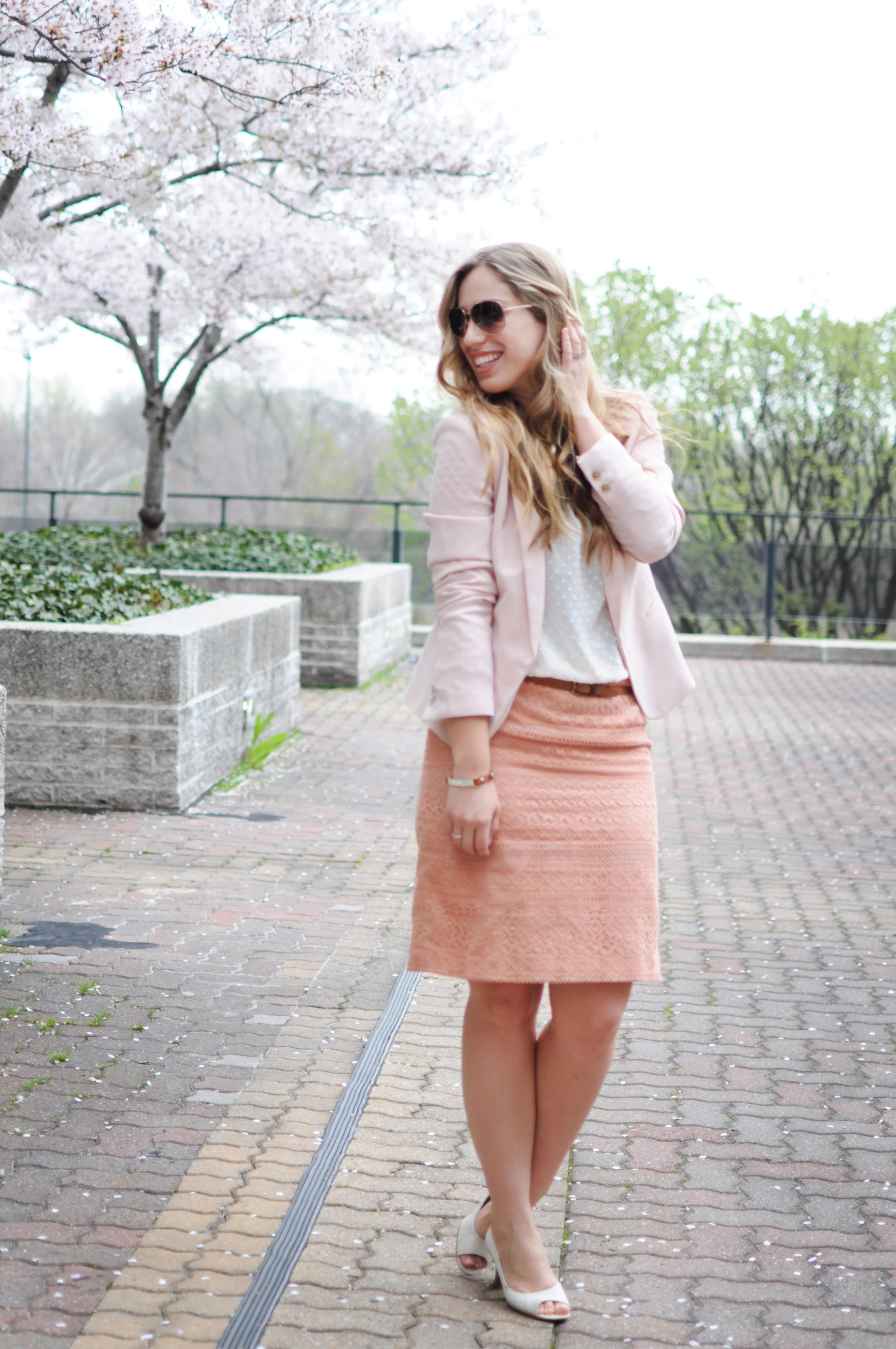 On Julien: Skirt, Lord & Taylor (similar here.) Blouse, J.CREW Factory (similar here.) Blush blazer, Ann Taylor LOFT (similar here.) Shoes, Franco Sarto (similar wedge version here.) Belt, J.CREW Factory (similar on sale here.) Bag, Kate Spade (similar here, borrowed from Amanda.) Pearl necklace, antique (but similar here.) Bracelet, unknown (but similar here.) Sunnies, Michael Kors.
