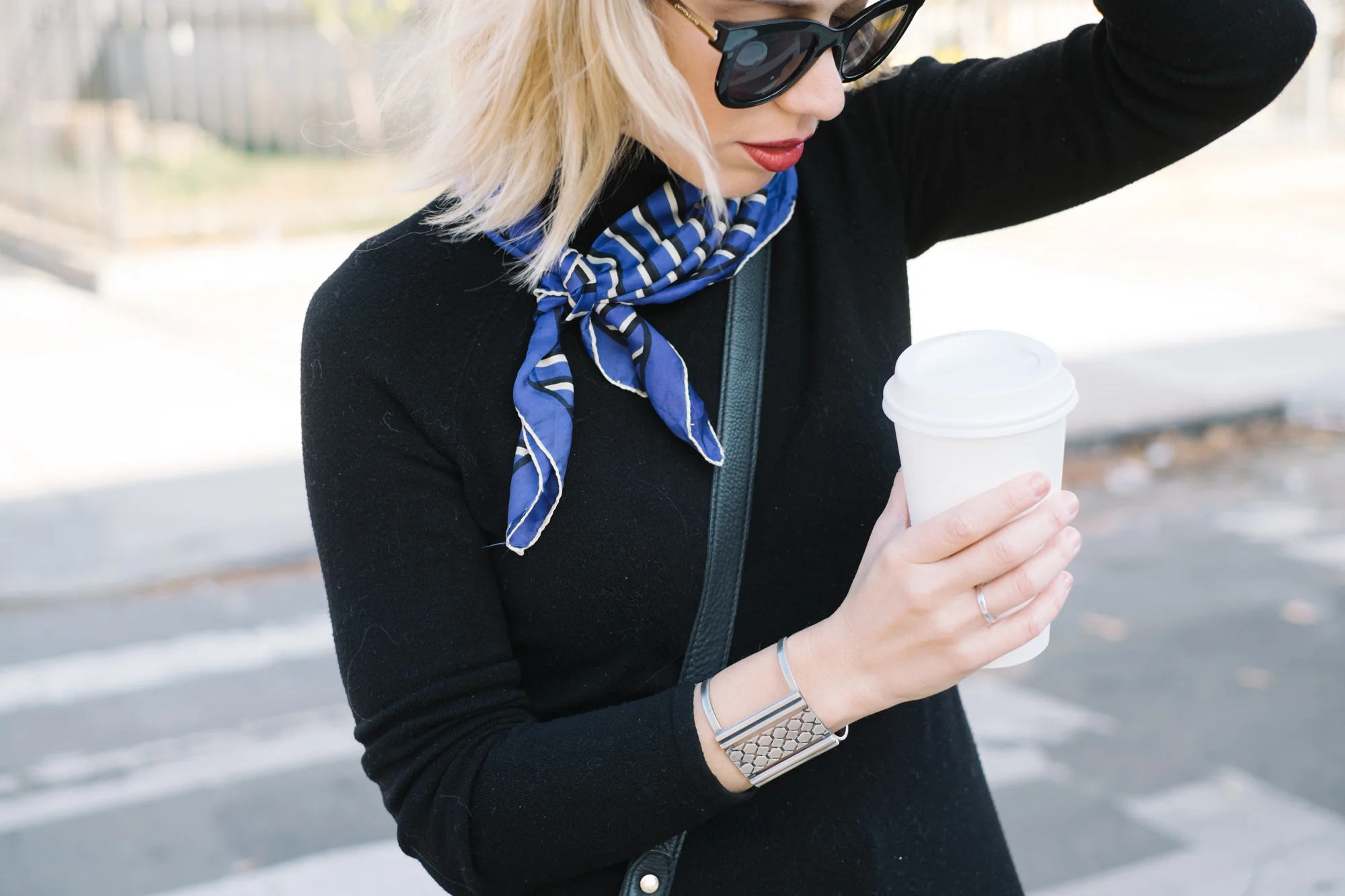 Wearing black turtleneck (stolen from mom, whoops), thrifted suede skirt (similar and love this one), vintage silk scarf (similar), Sophie Blake bracelet, Veja sneakers via Anthom, Melt Your Makeup lipstick (in Serrano) c/o.
