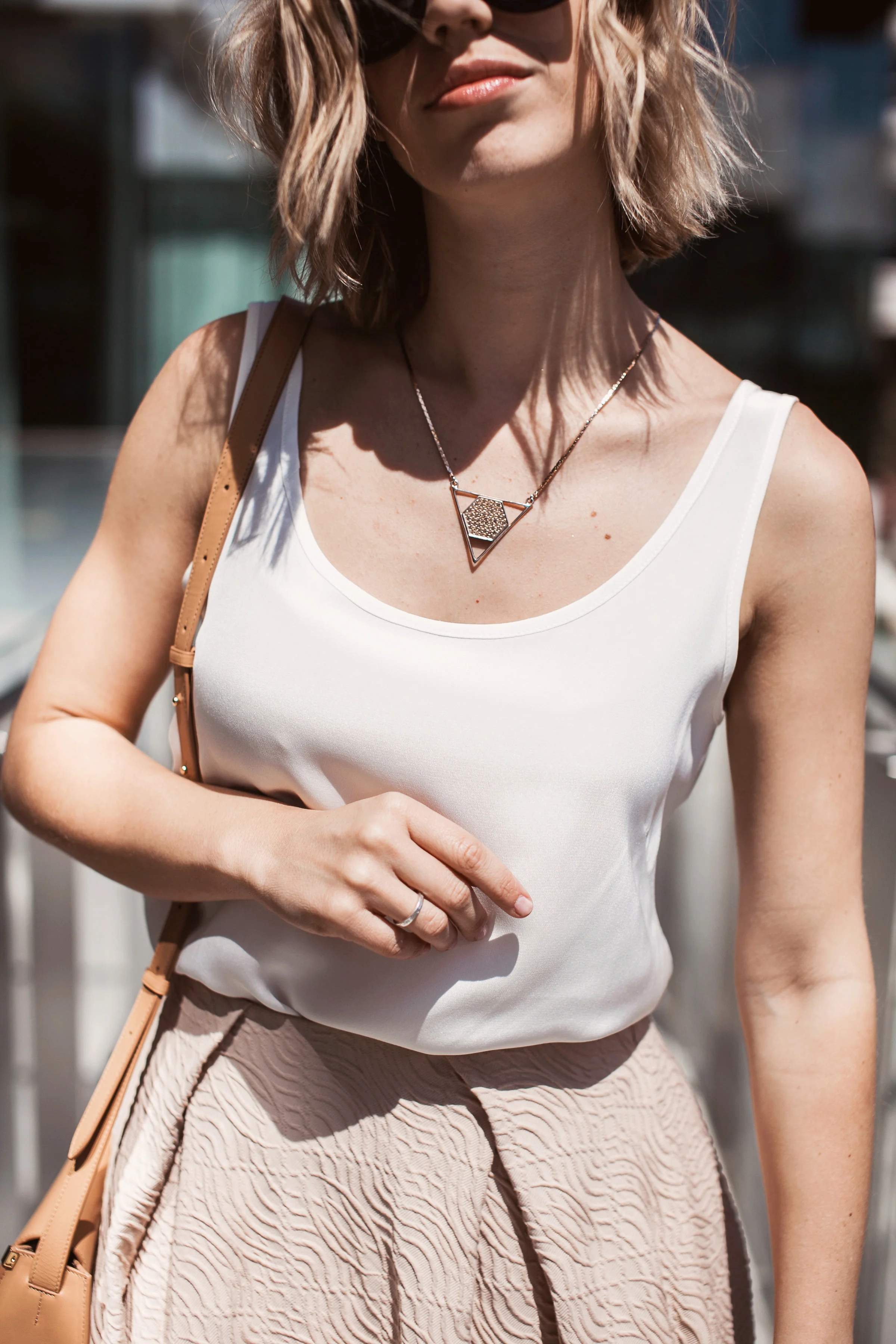 Case and point? This silk tank top and this gorgeous leather bag. Both are from one of my new favorite shops, Cuyana. This slow-fashion company based in San Fran is changing the way people shop, including myself. Their curated collection of pieces remind us that fewer, better things is the way to go. I’ve worn this top with ripped jeans and heels for an elevated weekend look and to an event with this insanely gorgeous skirt from another favorite shop of mine, Take 5 Boutique.