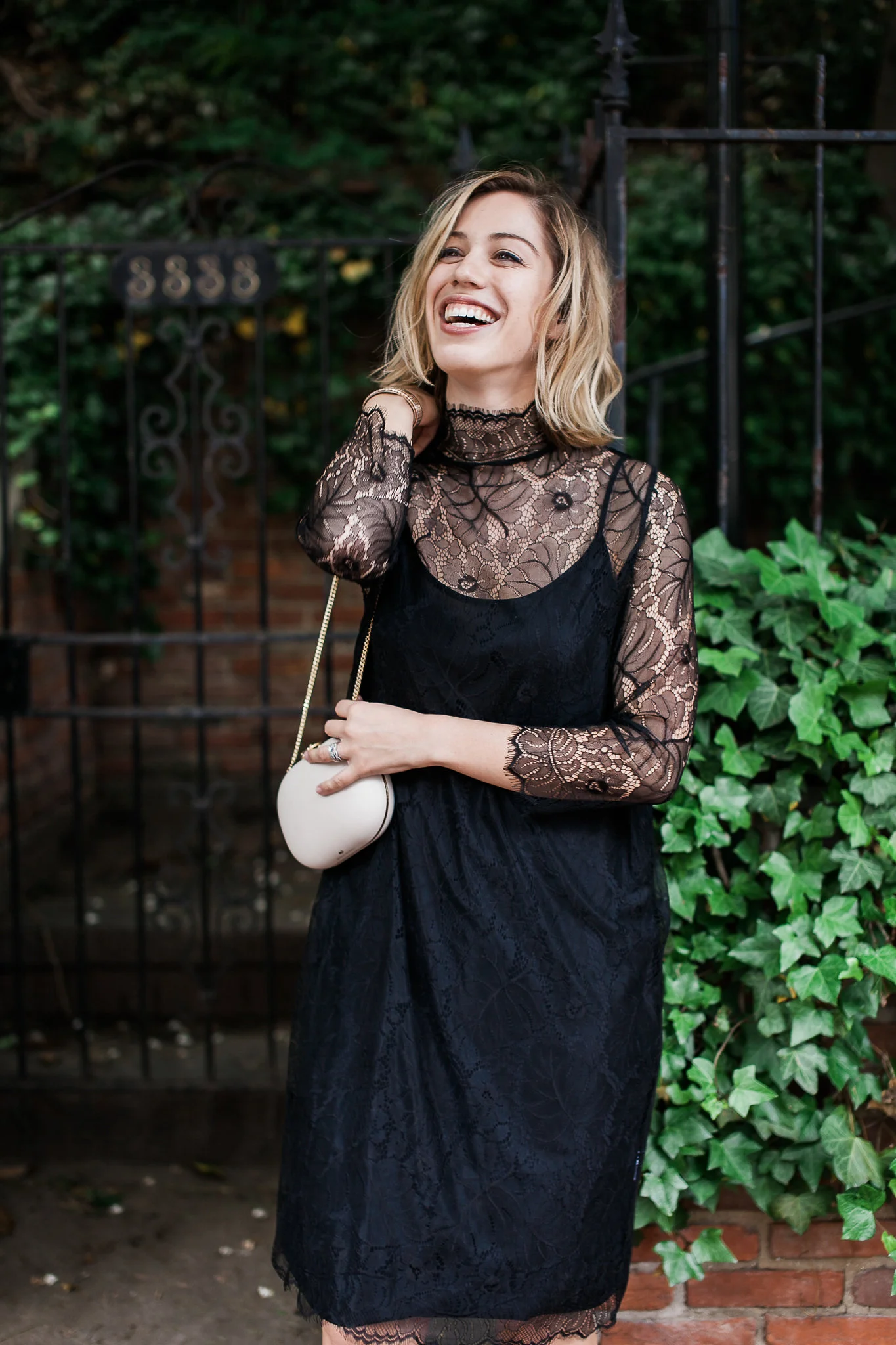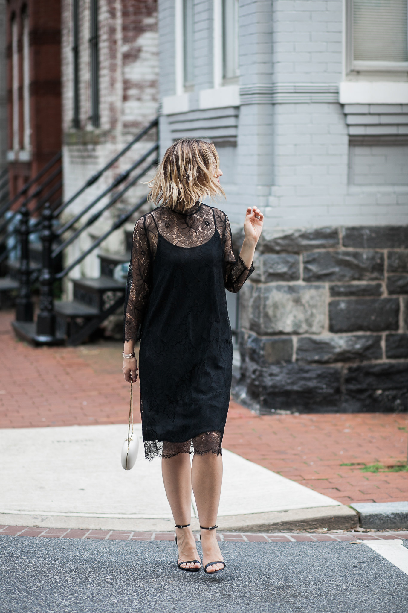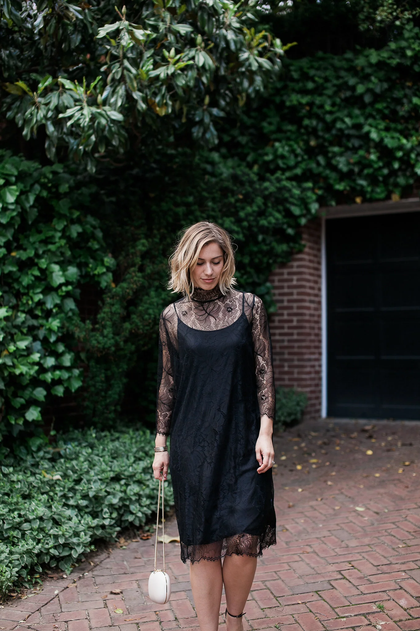 When I saw this Ganni dress, it was love at first sight. The lace is the softest I’ve ever felt, and the length is just right for a number of dressy occasions. My friend Natalie always says, “If you can immediately think of three different ways to wear something, get it” so this was an easy choice for me. While I’ve dressed it up here with a slip dress underneath, it would be adorable paired over high-waisted, wide-leg jeans and also with a cozy sweater come fall and winter.