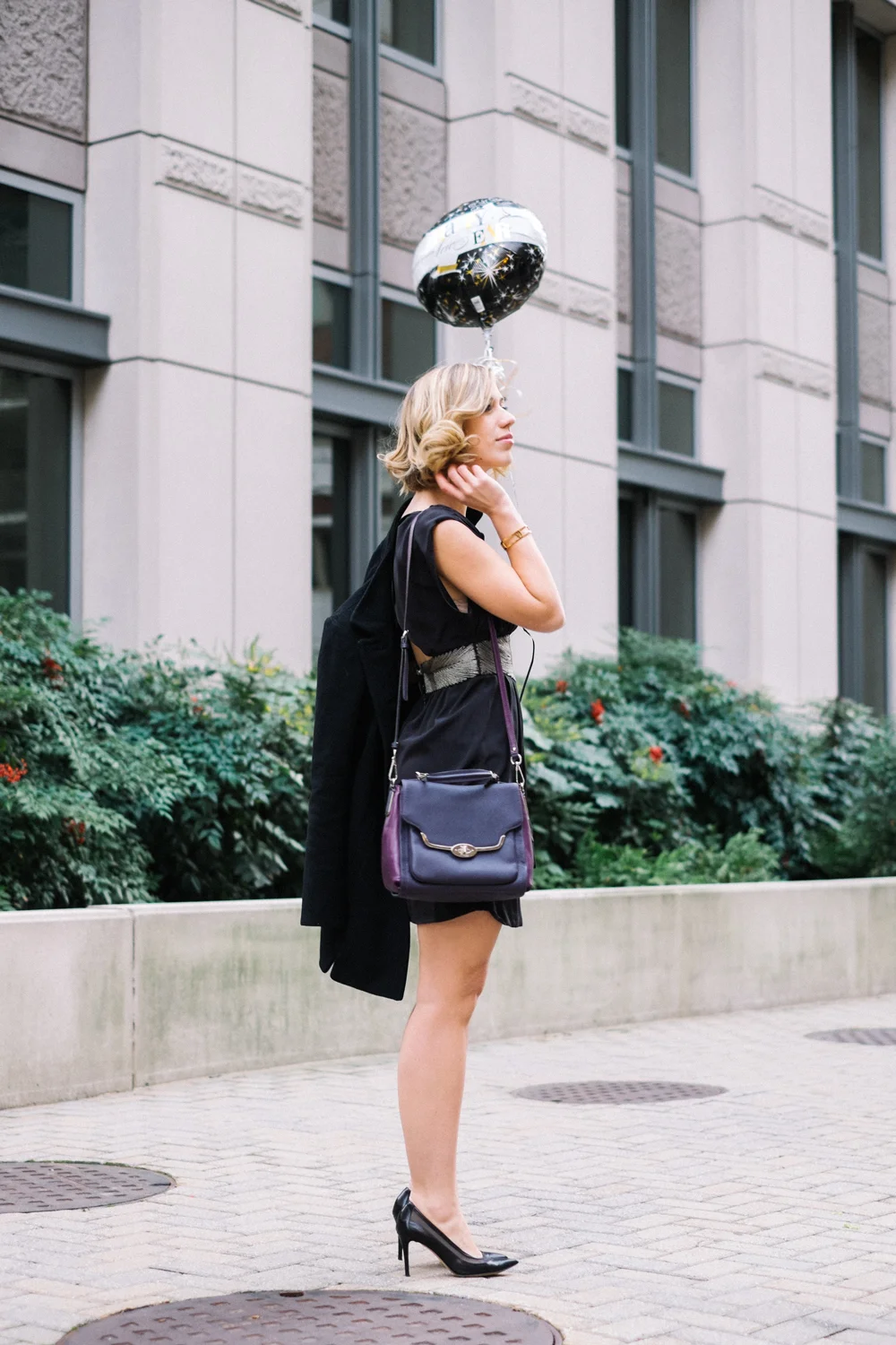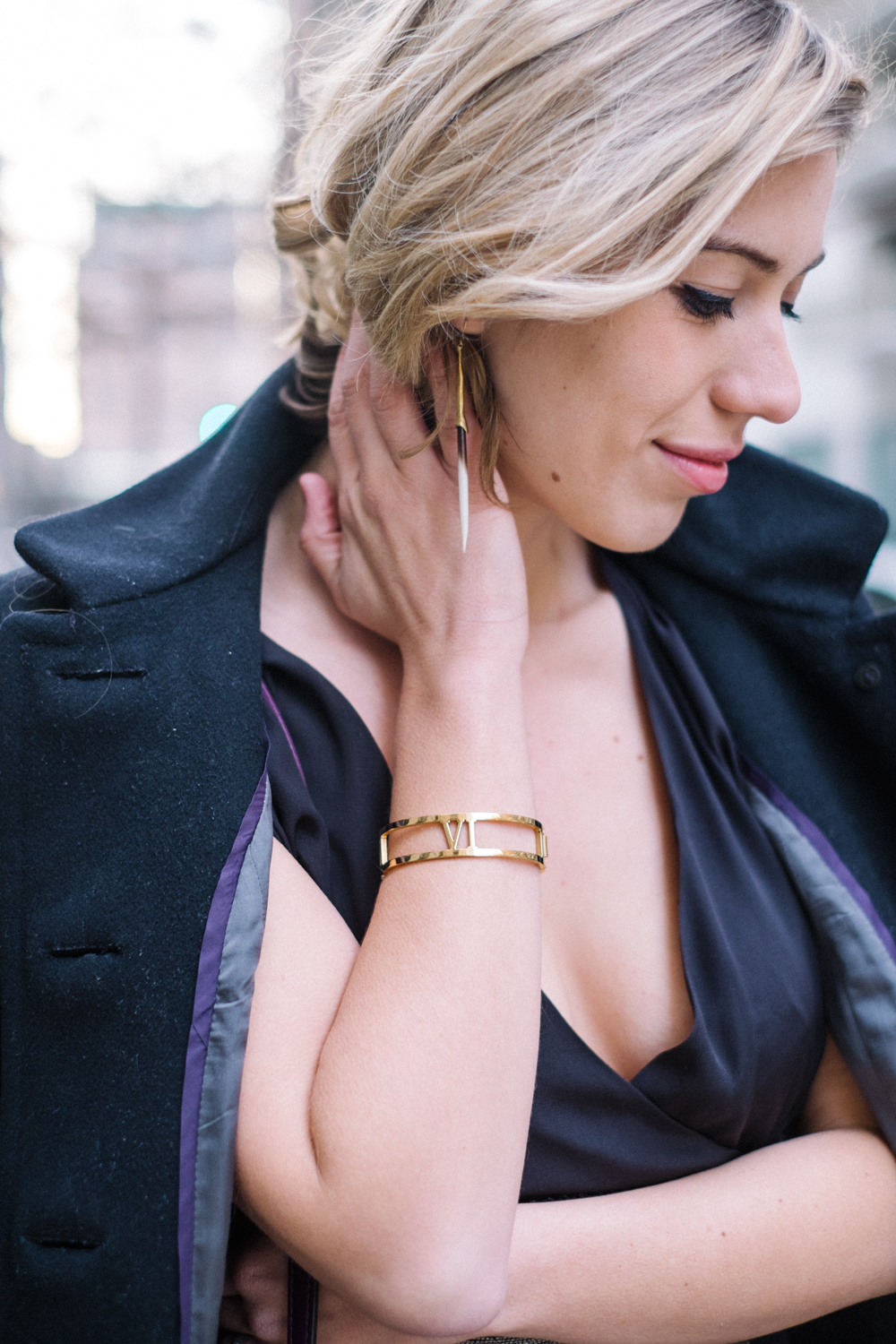 Wearing Tibi dress, M.Gemi pumps (similar), Hanuel bracelet, J.Crew coat (similar), K/LLER earrings via Lynn Louisa c/o and Coach bag (similar.) Hair styled by Hair Cuttery.