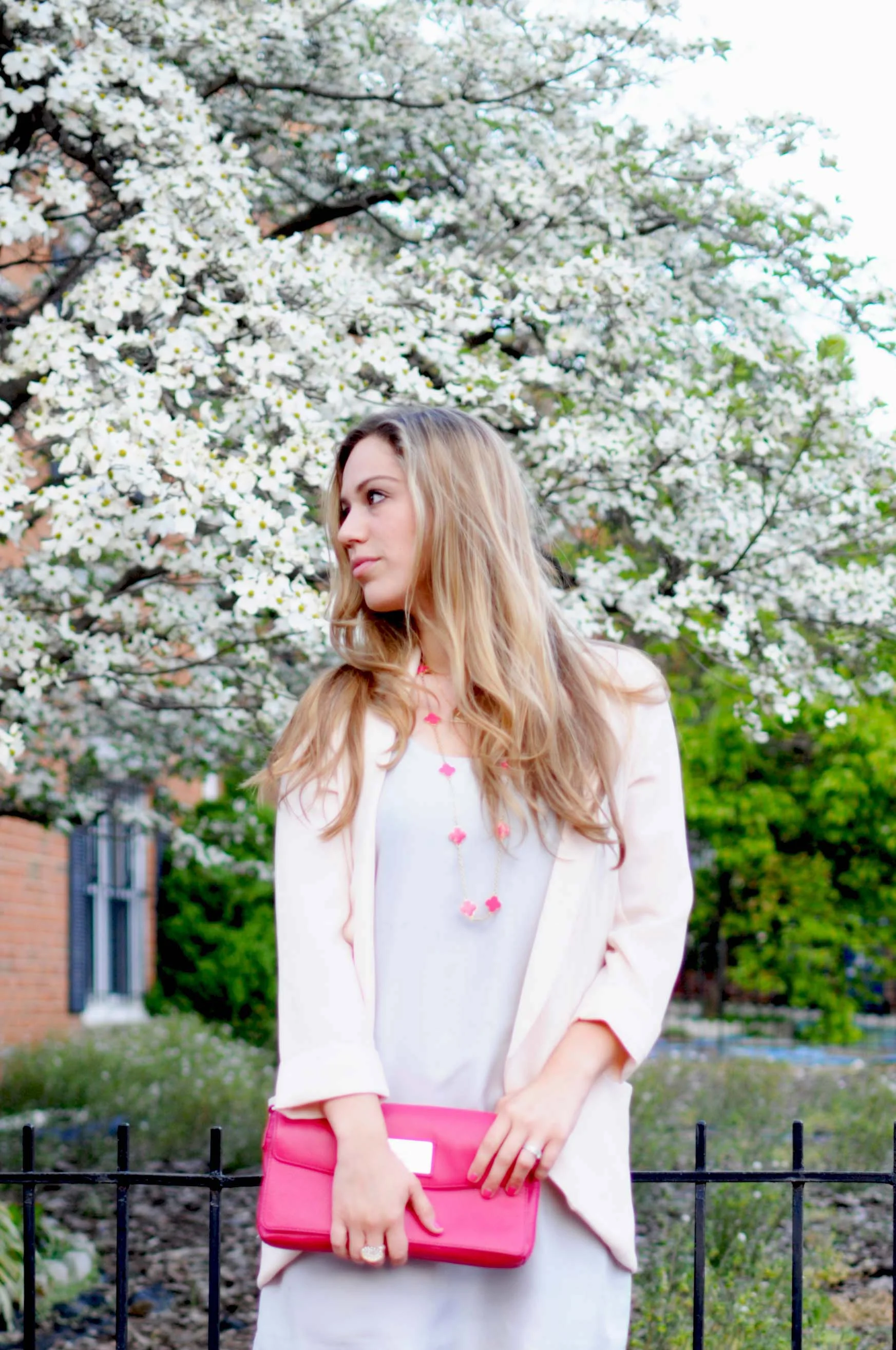 I paired these evening shoes with a silk sheath dress from J.CREW Factory and my favorite long blazer from Nordstrom for a dinner party on Capitol Hill. It’s the perfect combo because I can enjoy the warmer evenings without getting too cold when the temps drop. I added my bright DKNY purse for a little pop of color and tied it in with a fuchsia necklace. I probably should have worn tights (sorry, mom), but my legs needed a night on the town too.