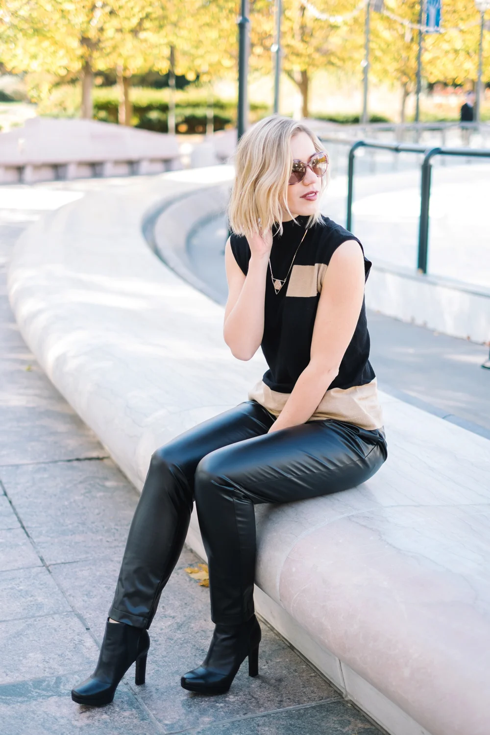 Wearing faux leather pants via Take 5 Boutique c/o, Vince Camuto top, Sophie Blake necklace, Via Spiga booties