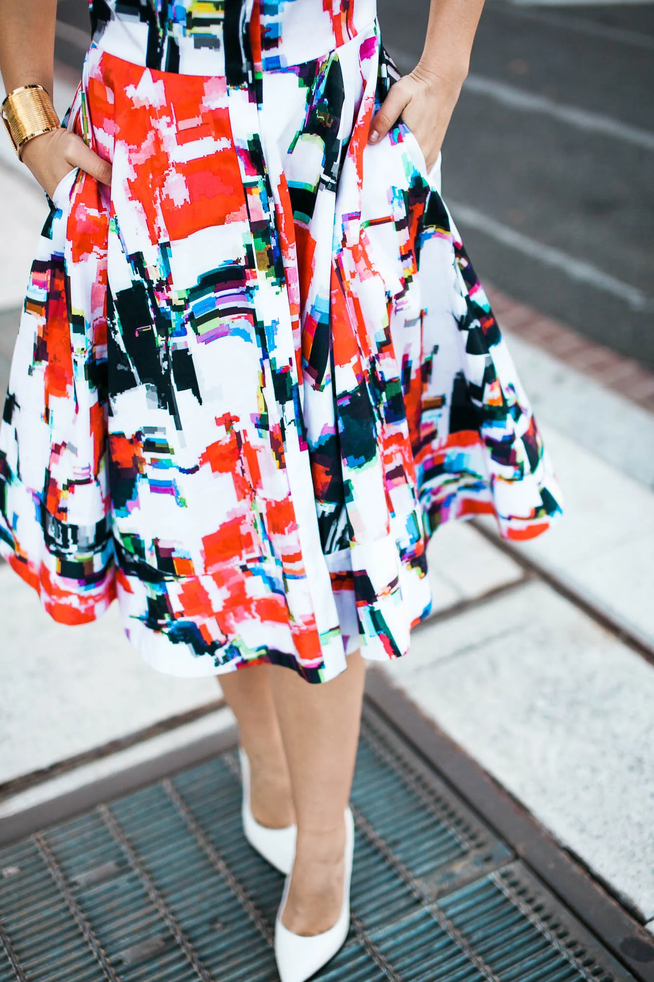 I love who I become in this dress. All of a sudden, Iâm smiling at strangers and twirling down the sidewalk. Iâm sitting at the edge of a water fountain at CityCenter, drawing hearts in the water. Iâm a whirlwind of color (which is not usually the case for me!) When color is done right, I canât help but want to wear it to death! The full skirt and high waist add just the right touch of girliness while the high neckline and vibrant color palette add the perfect amount of modern elegance.