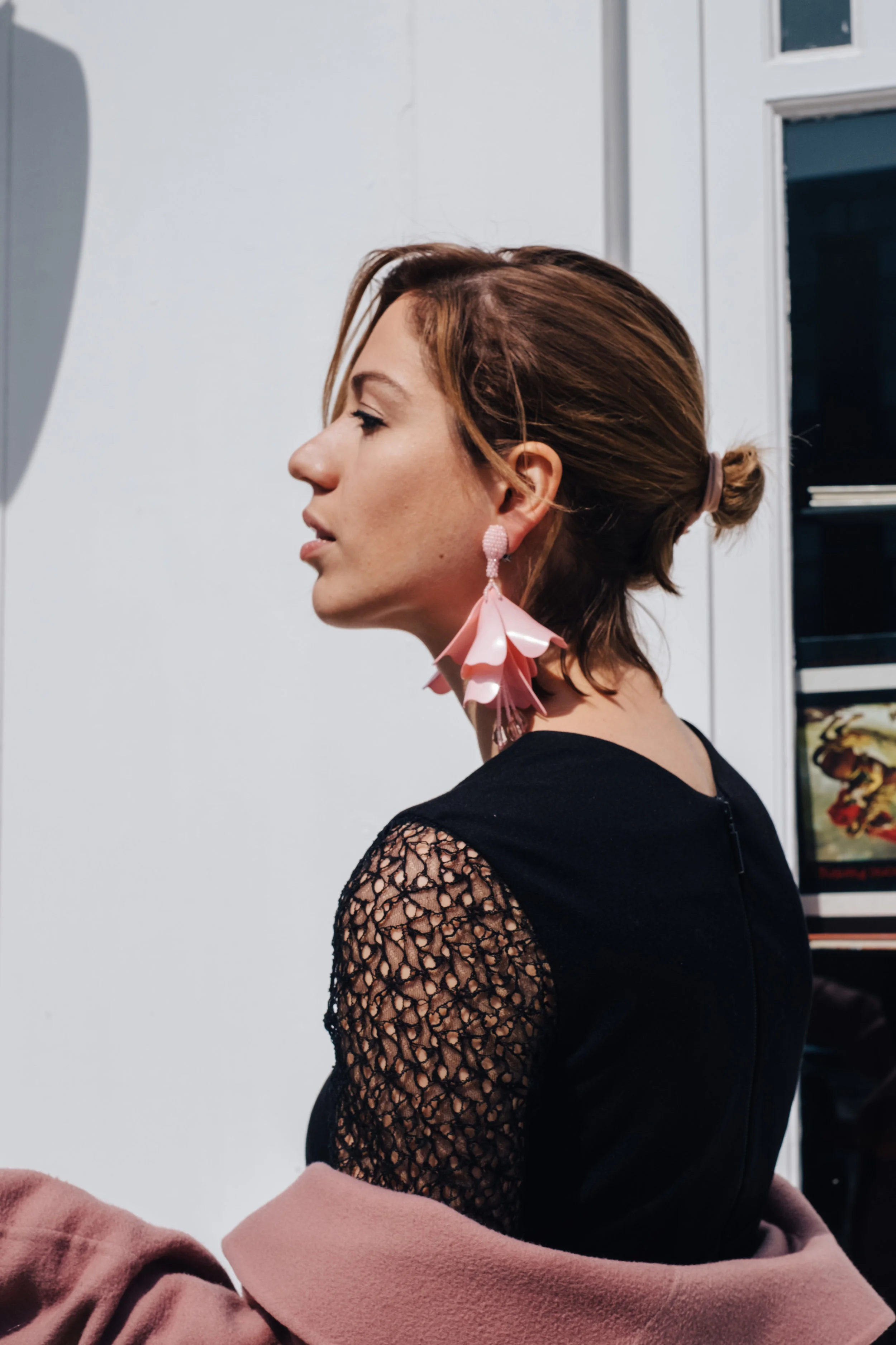 Wearing Theory coat, Jason Wu dress and Oscar de la Renta earrings via Rent the Runway, Cuyana backpack, M.Gemi boots