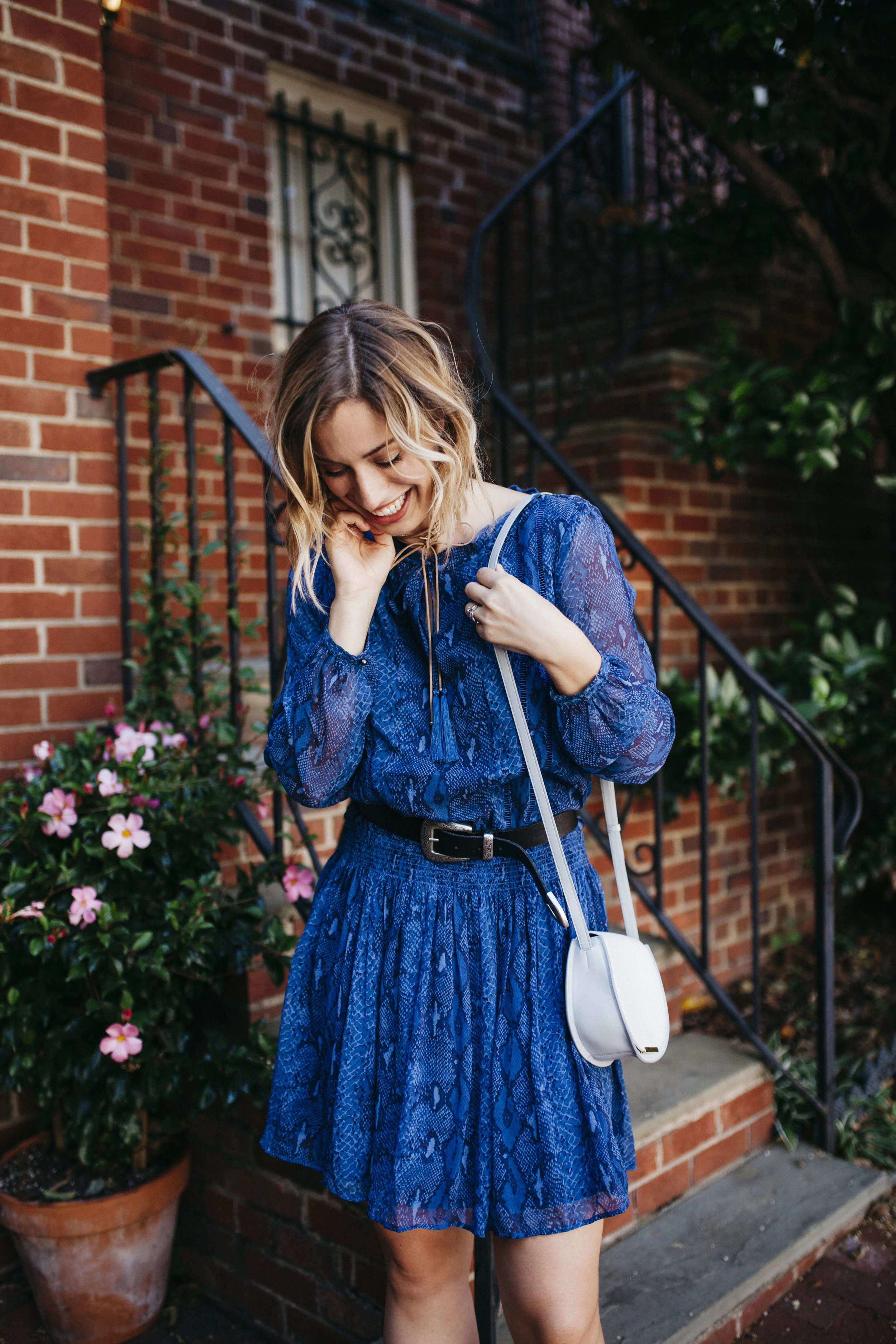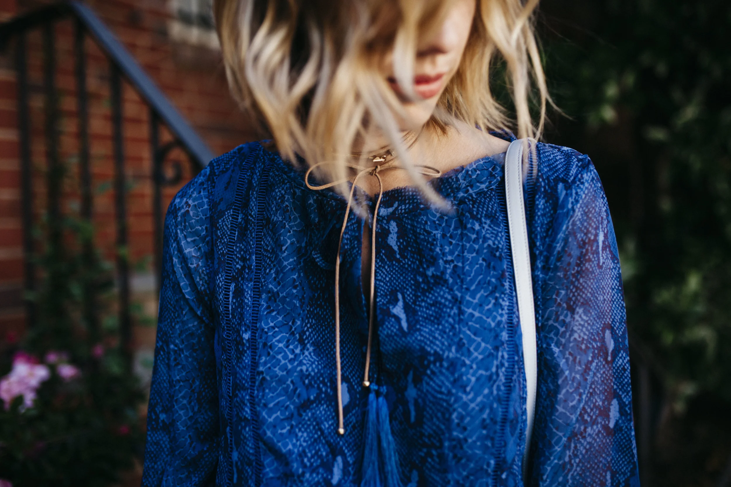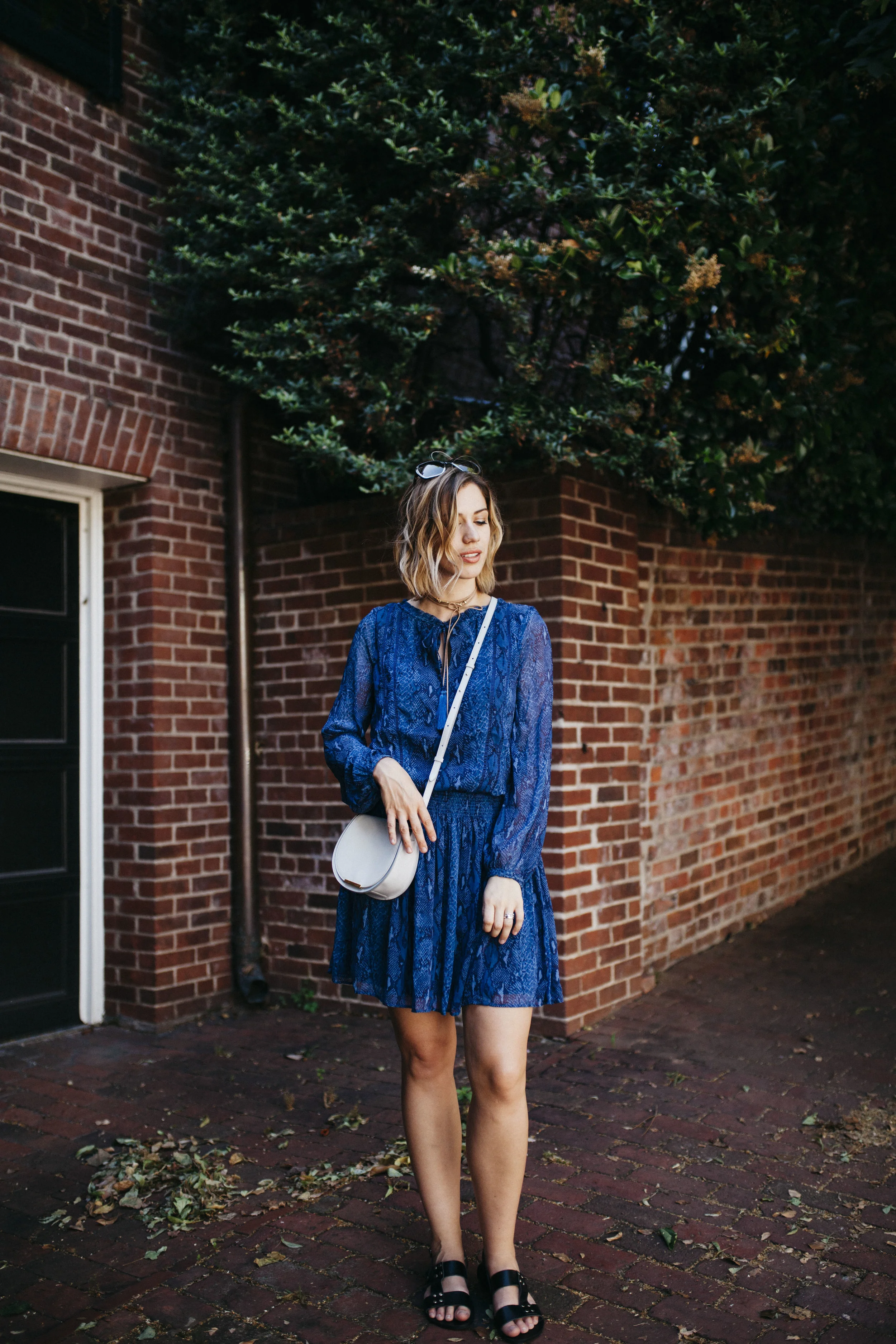 This dress is THE most beautiful blue color and while I’ll admit I was hesitant about the snakeskin print at first, it’s actually the prettiest subtle print. I paired it with my James Hock sandals (that I’ve been wearing non-stop), my new Cuyana mini-saddle bag, and a suede choker from this amazing company called Headbands of Hope. For each piece purchased, they give back to cancer charities and hospitals.