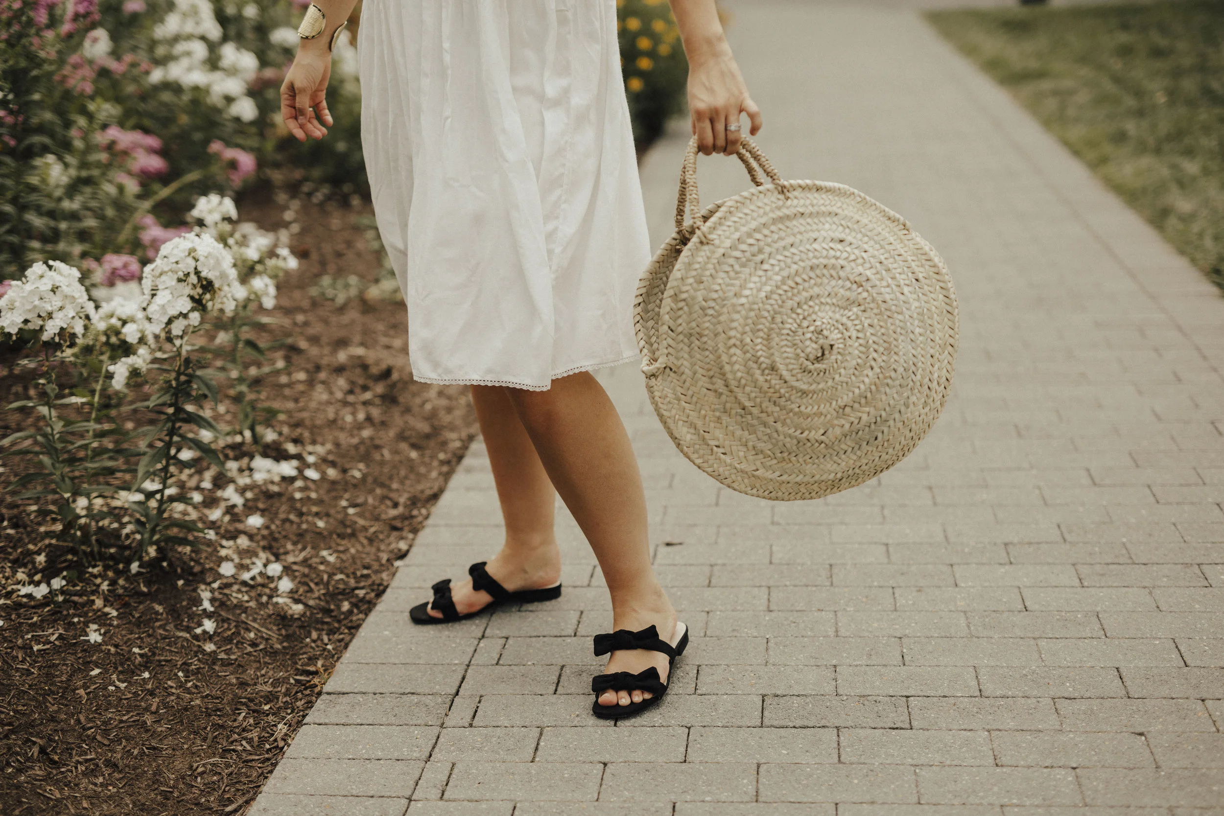 Wearing French Connection dress, H&M sandals (under $20!), Nashelle necklace, French Baskets bag, Sophie Blake bracelet