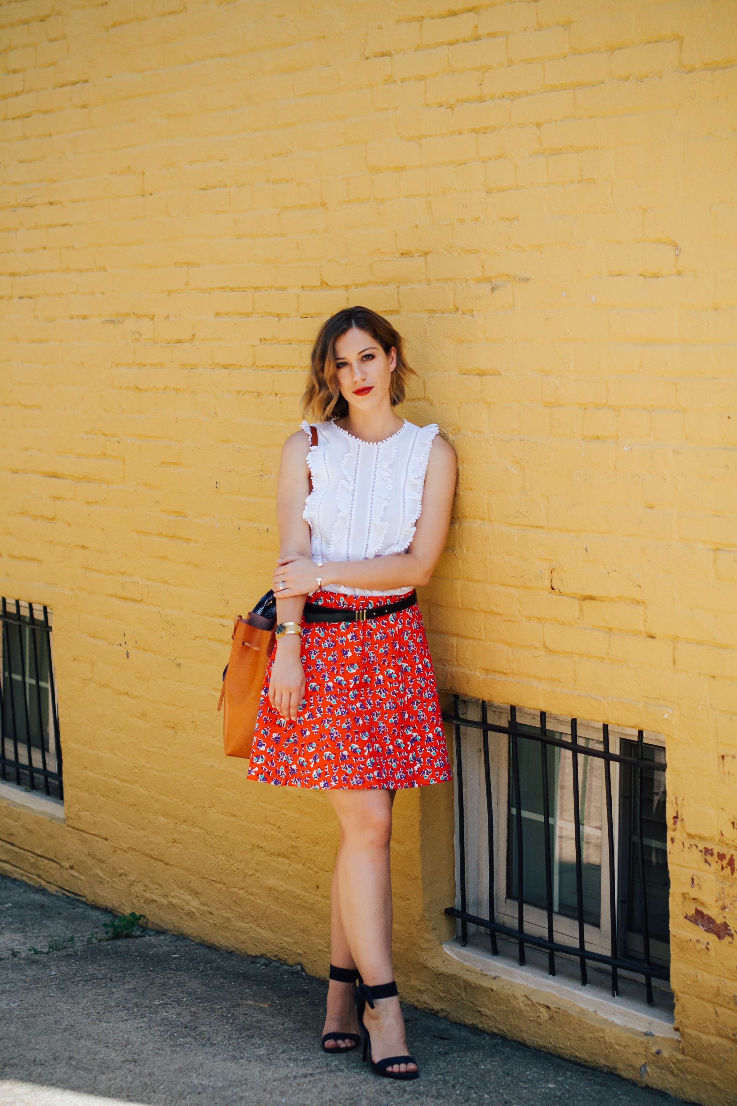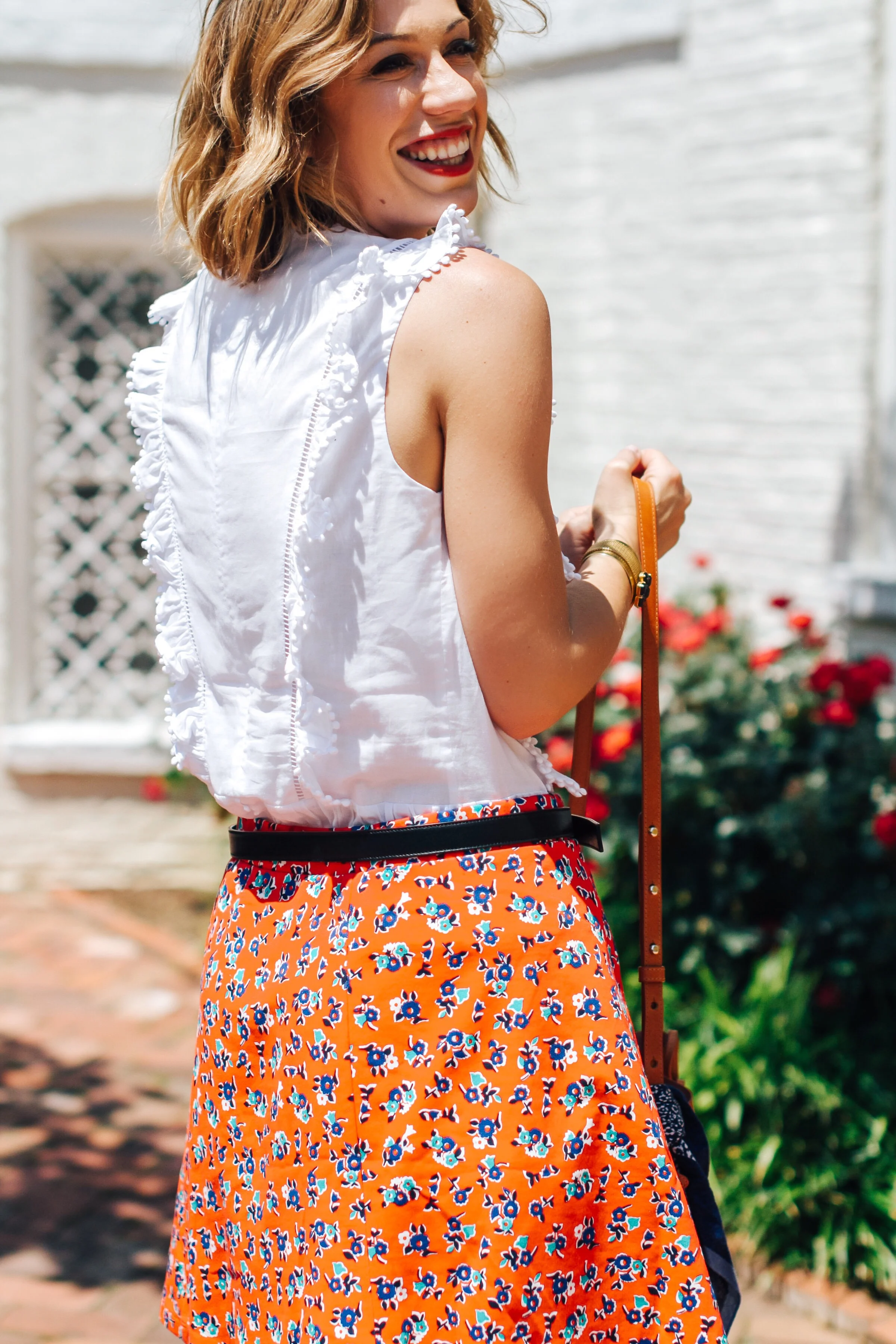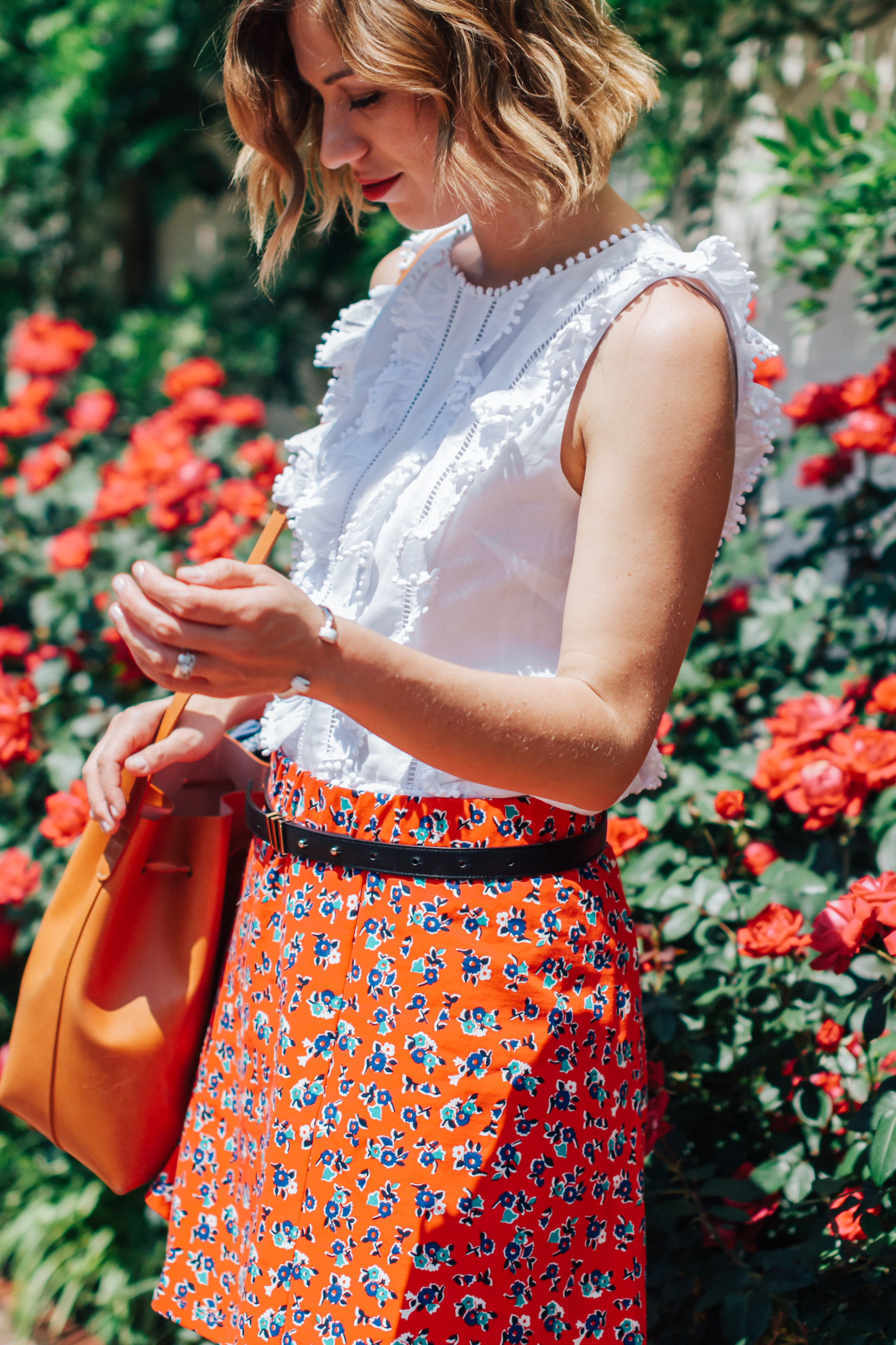 Wearing Draper James blouse and skirt (size down) c/o, Mansur Gavriel bag, Banana Republic sandals (on sale!), Sophie Blake gold bracelet and silver bracelet, Cuyana belt