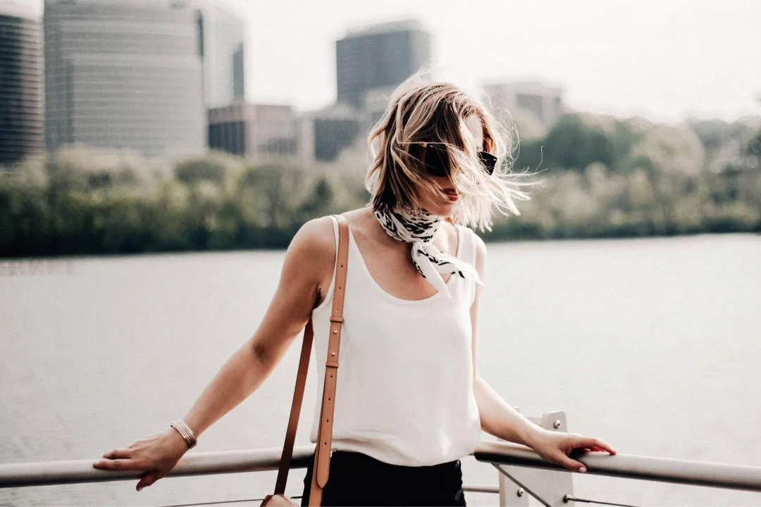 Wearing: Cuyana silk tank and saddle bag c/o, Erika Schrieber skirt, Banana Republic sandals, The Scarf Shop scarf, Polette sunnies, Sophie Blake bracelet.