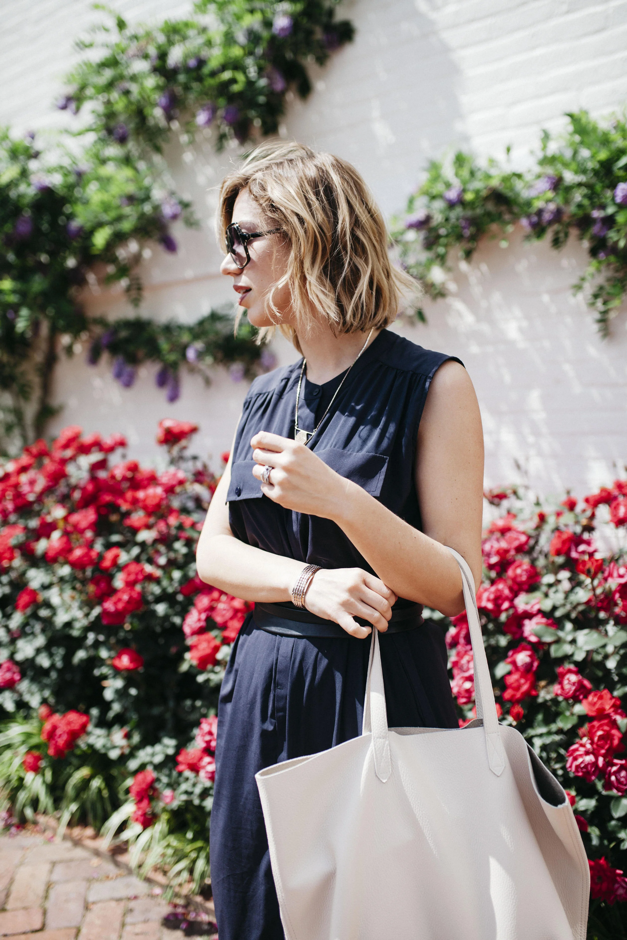 Wearing: Achro Dress (similar), Haven Ave loafers via iStyleUp, Derek Lam sunnies via Ditto, Sophie Blake necklace, Sophie Blake cuff, South Moon Under belt, and Cuyana tote bag in Ecru.