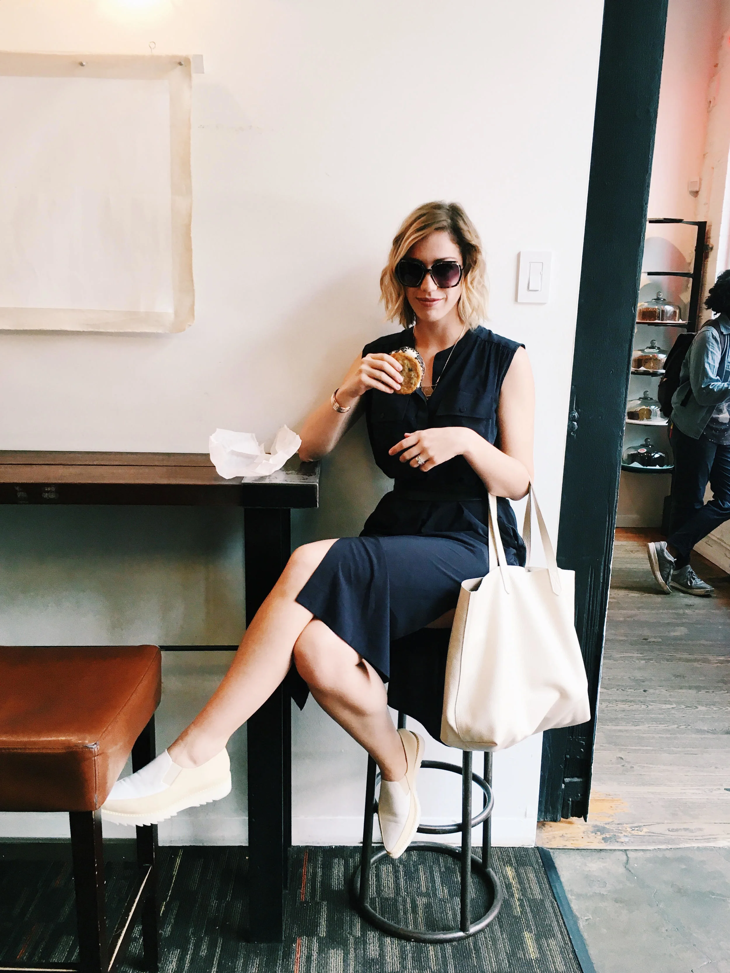 This navy blue Achro dress has been a winner from day one. I wear it to work, on dates, and today, to get ice cream with two of my friends, Erin and Luke! It all started when we THOUGHT we were going to Baked and Wired for cupcakes…but then upon entering, I saw a tiny photo in the back of an ICE CREAM SANDWICH.