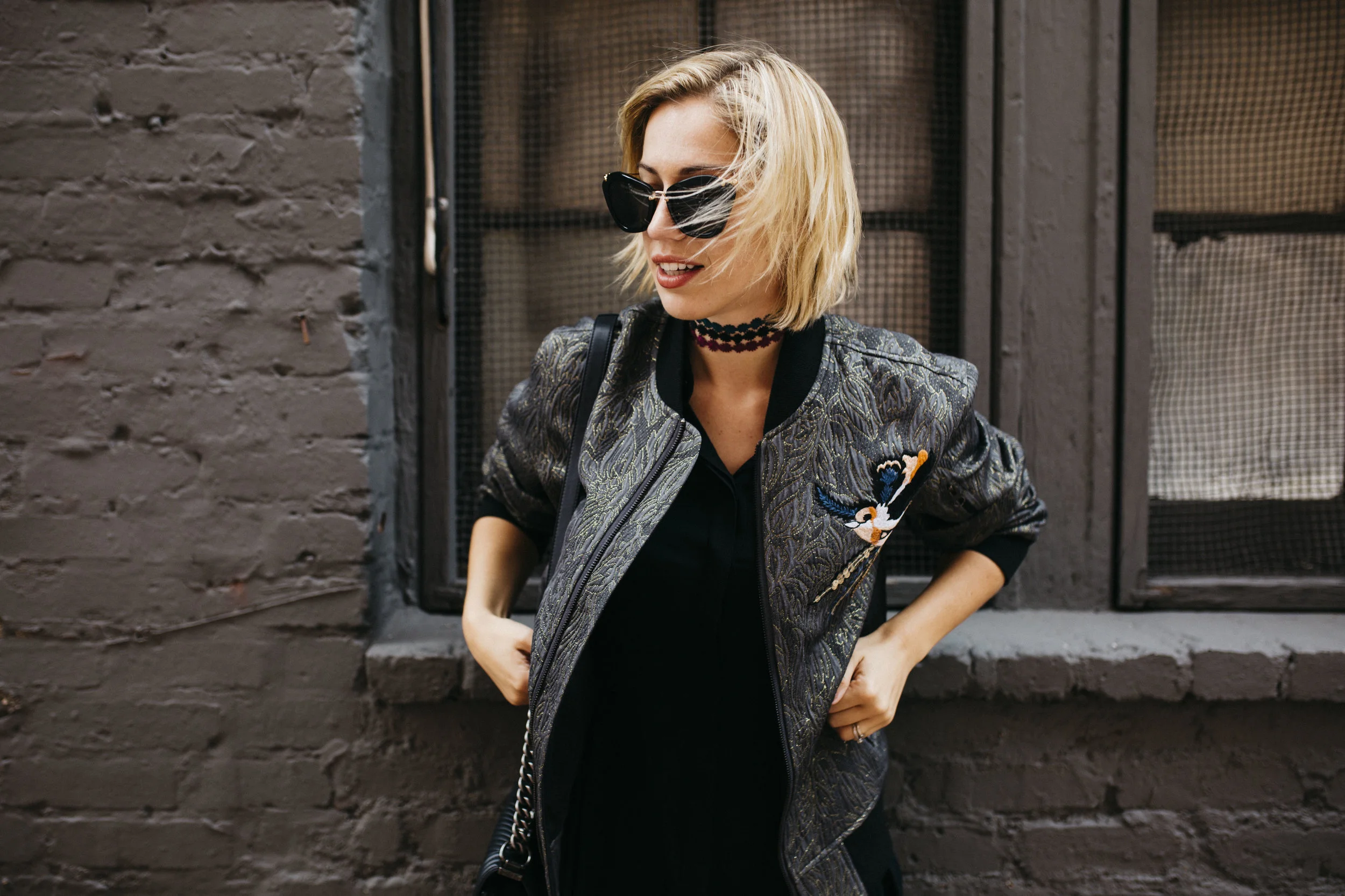 Wearing MM Vintage bomber jacket, Rag & Bone dress (similar), Chinese Laundry OTK boots, Bauble Bar chokers c/o, Chanel bag via BBOS, Miu Miu sunglasses.