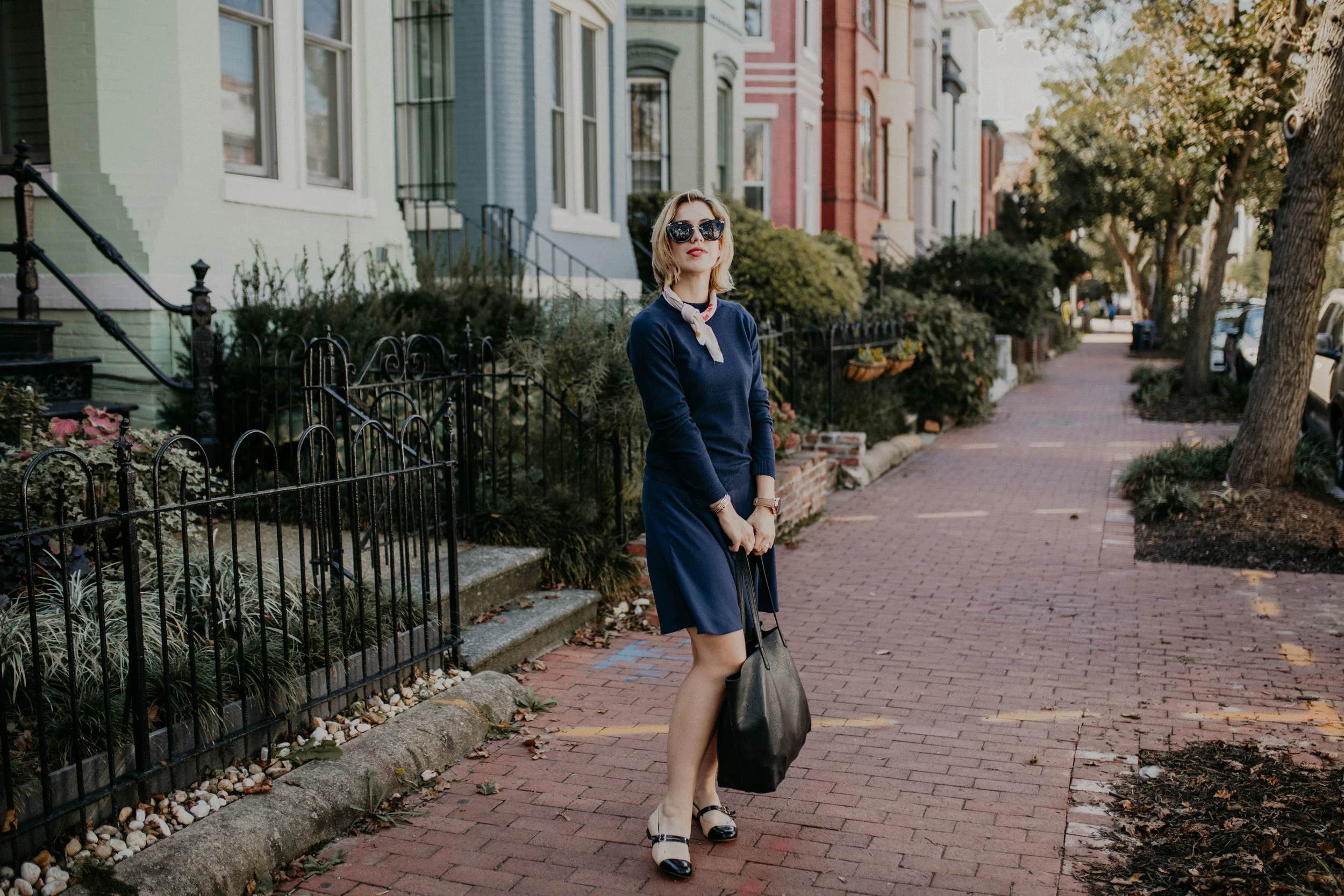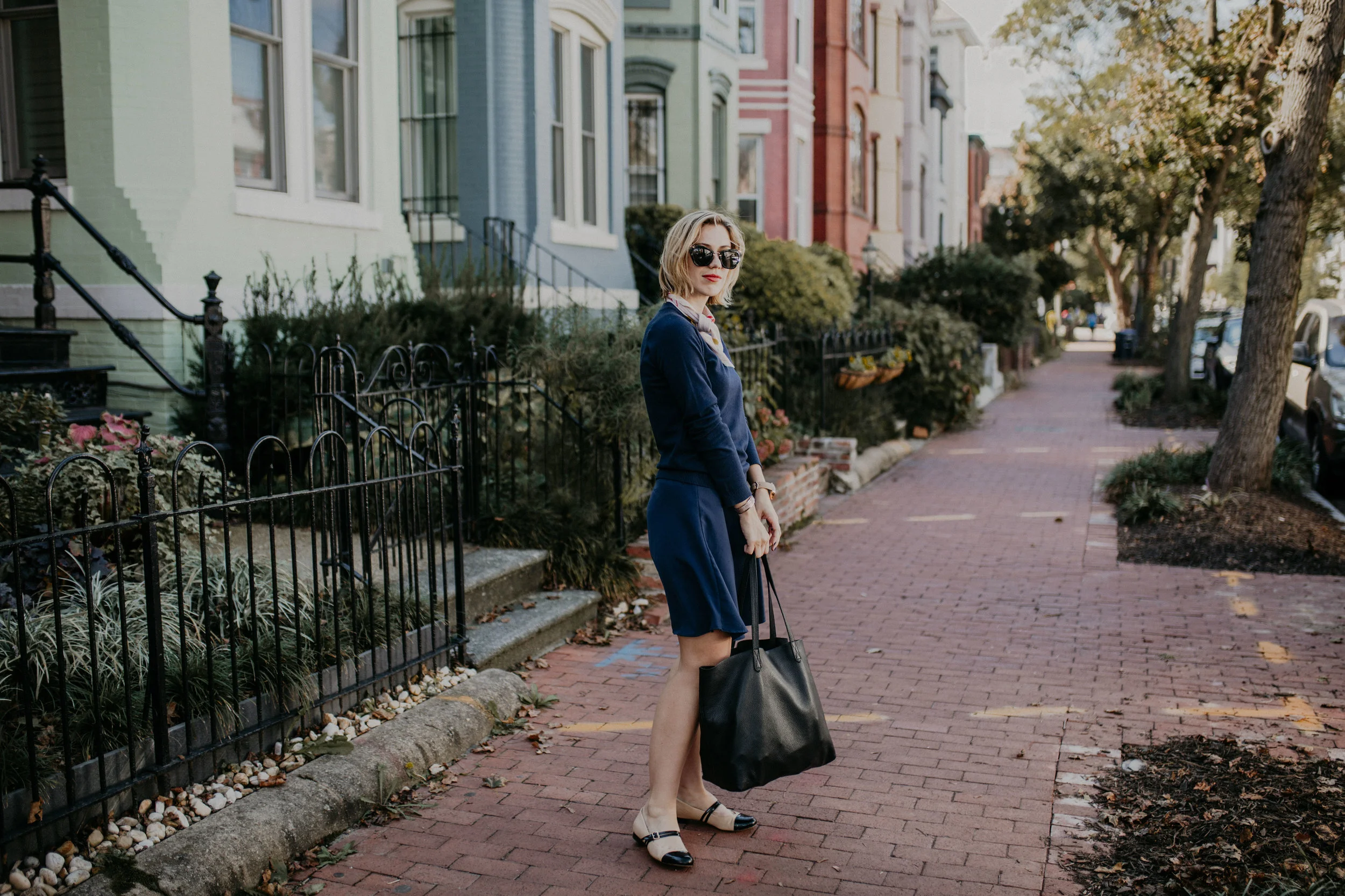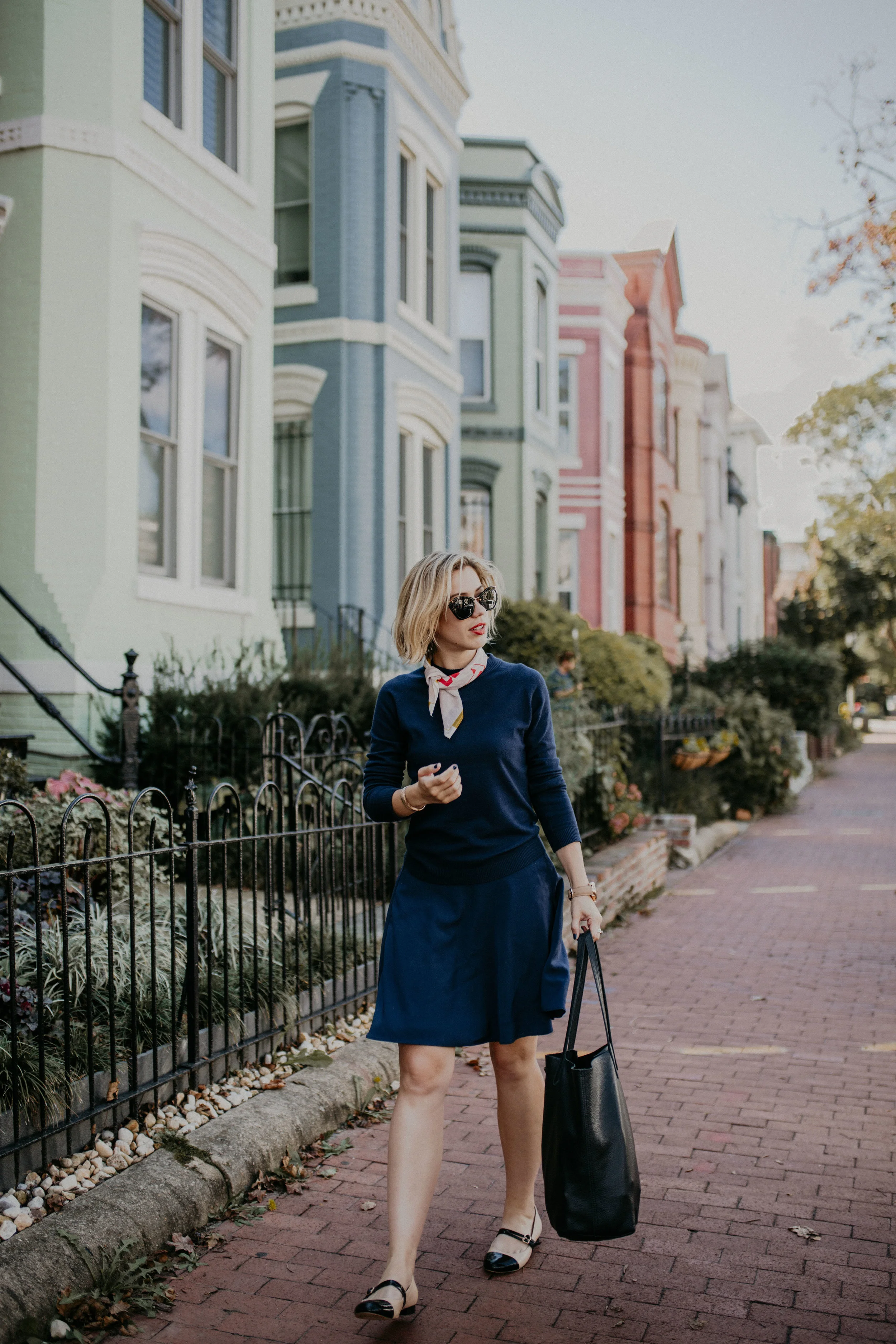 Wearing Target skirt (similar), Take 5 Boutique sweater, Ukies flats c/o, Odeme scarf and nail polish in Odeon c/o, Fossil Q smartwatch c/o, Miu Miu sunnies, Sophie Blake bracelet, Cuyana tote.