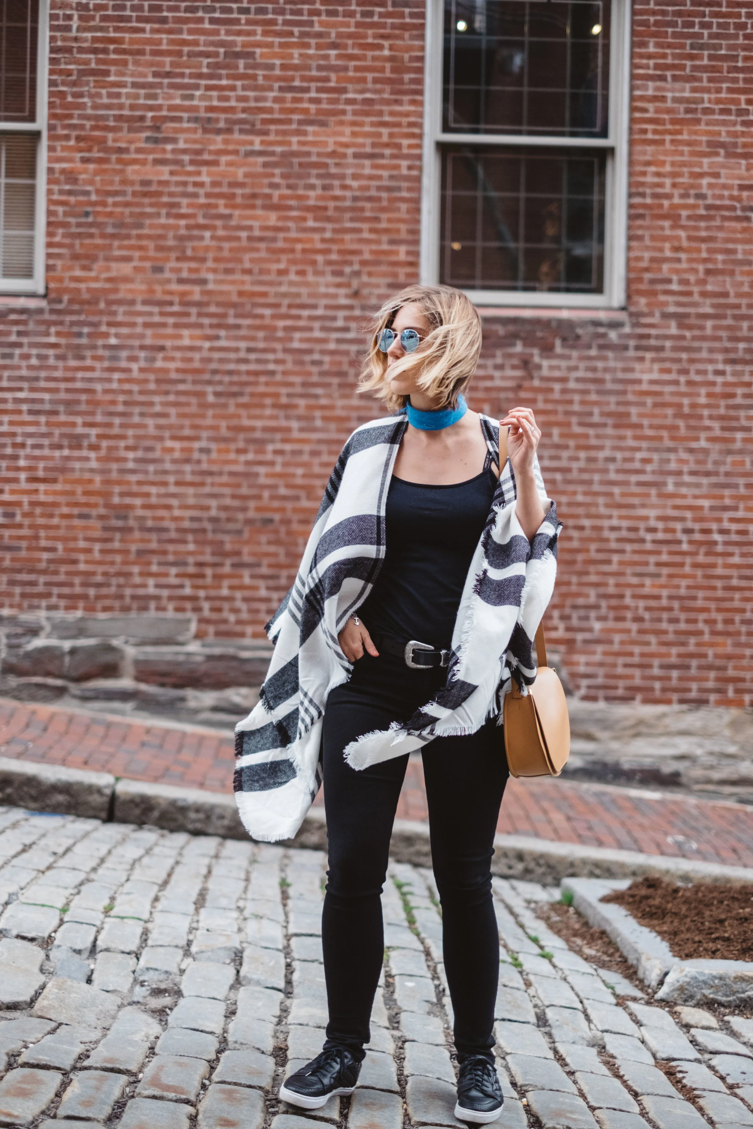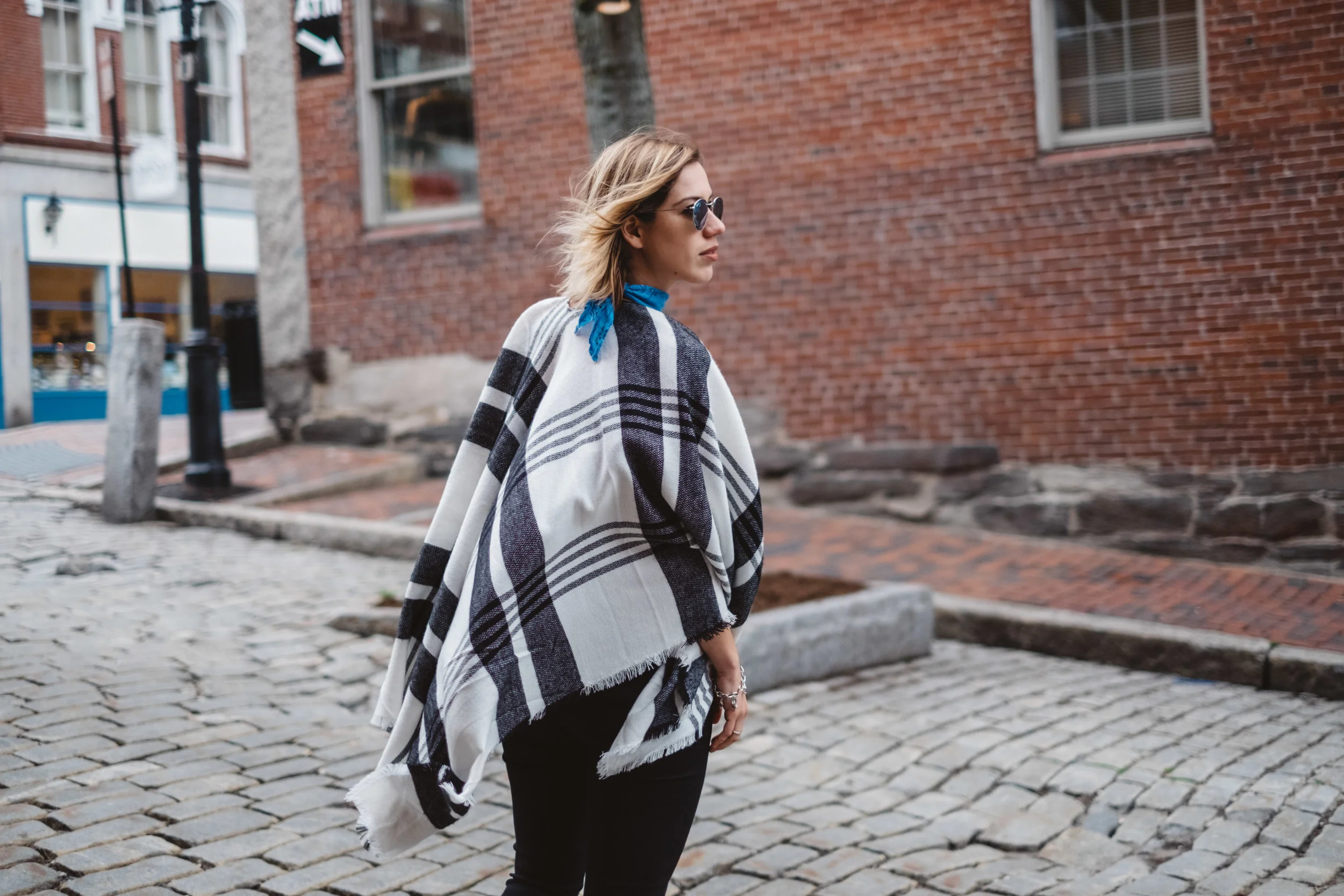 Wearing BP poncho (sold out, LOVE this one and this one!), CoH jeans, Matt Bernson sneakers (similar), black tank, Cuyana bag, Urban Outfitters belt, Ray-Ban sunglasses, Tiffany & Co. charm bracelet, blue bandana (similar from J.Crew)